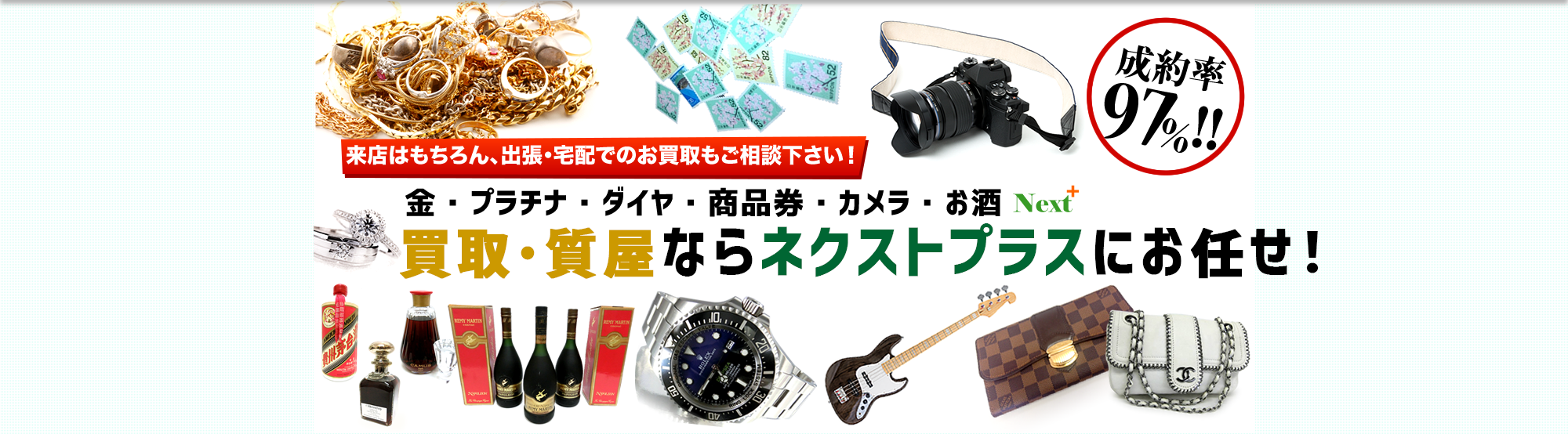 来店はもちろん、出張・宅配でのお買取、質預かりもご相談下さい! 金・プラチナ・ダイヤ・商品券・カメラ・お酒 お買取、質預かりならネクストプラスにお任せ!